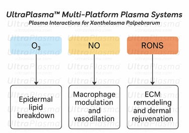 Xanthelasma palpebrarum (XP) is a form of cutaneous xanthoma characterized by lipid-laden histiocytes in the dermis, often presenting as flat, yellowish lesions on the medial canthi. While benign, the cosmetic disfigurement prompts treatment. Existing methods can lead to pigmentary changes, scarring, or recurrence. UltraPlasma™ offers a non-contact, controlled-depth, and multi-gas plasma-based alternative, showing promising results in lesion clearance and tissue normalization with minimal side effects.